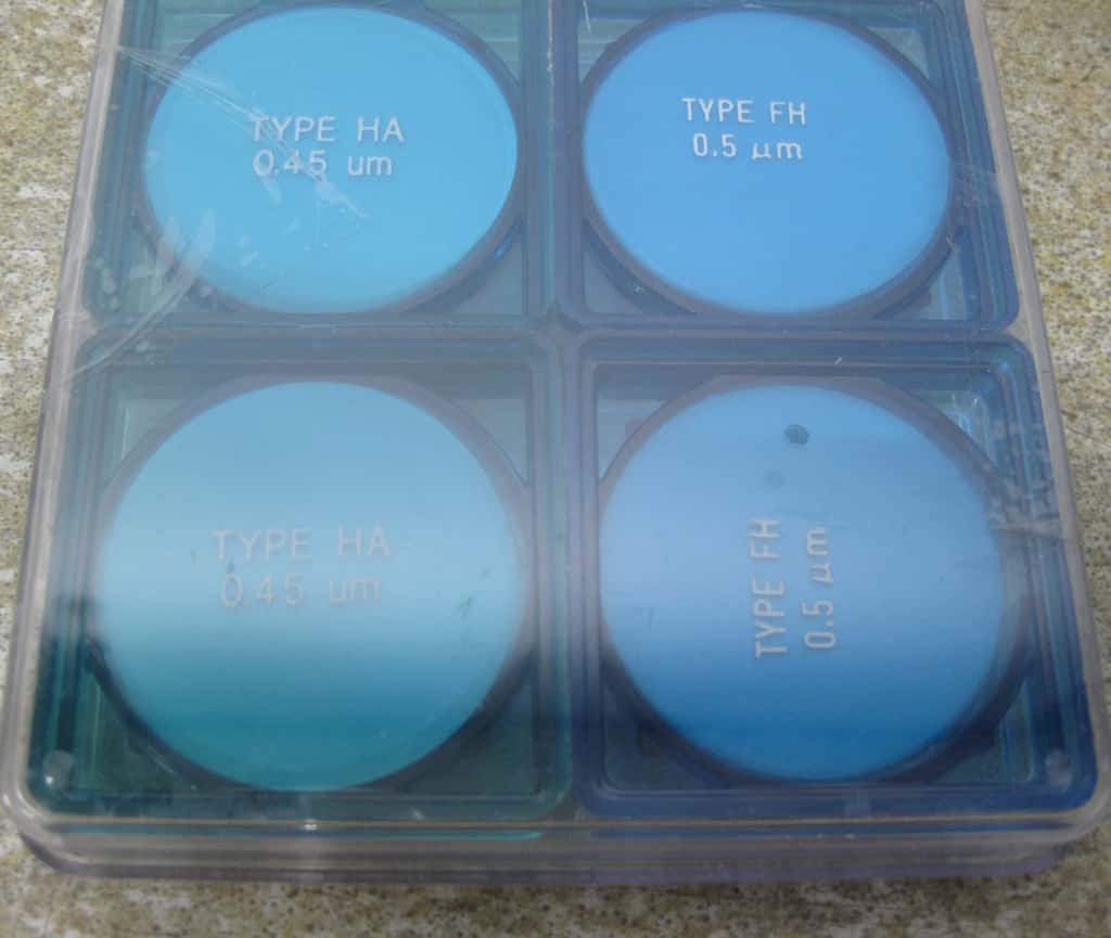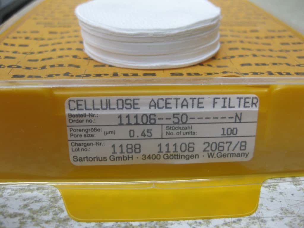 Een komplete filterset, bestaande uit een membraan druk/zuig pompje van Cole-Parmer en een 800 ml glazen drukvat met een “luer-lock” filter aansluiting. Bijgeleverd worden verschillende Millipore (HF/HP) filters en Sartorius Cellulose acetaat filters.