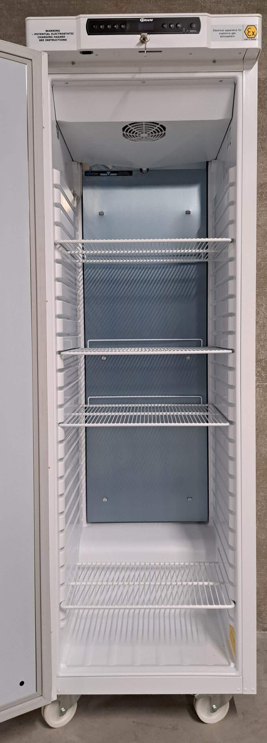 Weinig gebruikte Gram BioCompact II RR410 medicijnkoelkast met 4 kunststof gecoate draagroosters en wielen. De medicatiekoeler is geschikt voor plaatsing in Categorie 3 Zone 2 ATEX-zones en heeft een digitaal display.