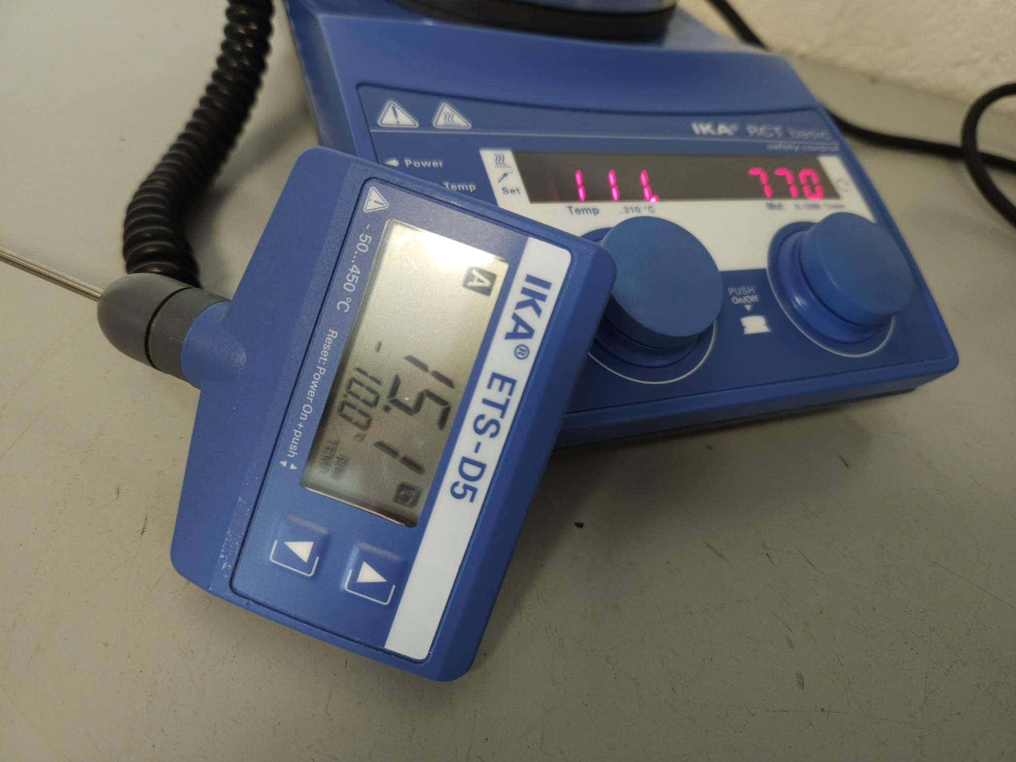 IKA RCT basic safety control magneetroerder met verwarming en IKA ETS-D5 contact thermometer Nauwkeurige meting en regeling van ingestelde temperatuur door meting van en sturing op temperatuur van het medium, geen overschot. Geleverd als afgebeeld