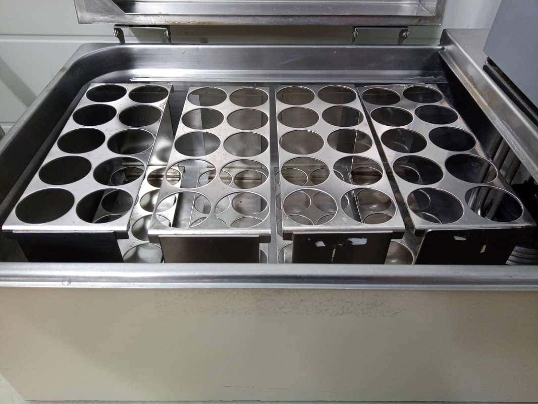 Julabo 20B waterbad met deksel en Julabo EC-Basis verwarmingsdompelcirculatiepomp met digitale temperatuurweergave. Inwendige badbreedte x diepte x hoogte = 38 x 27 x 12 cm. Inbegrepen zijn vier rekken, elk van lengte 210 mm, hoogte 134 mm, breedte 80 mm, voor buizen met een diameter tot 36 mm en een lengte vanaf 120 mm. Uitwendige breedte x diepte x hoogte = 57 x 36 x 35 cm, gewicht 14 kg, spanning 230 VAC.