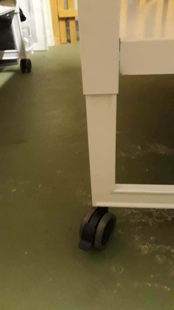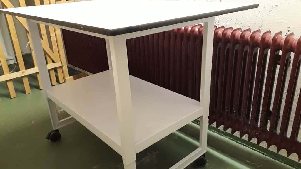 Werkoppervlak van laboratoriumkwaliteit, stalen poten en stevige, vergrendelbare zwenkwielen.