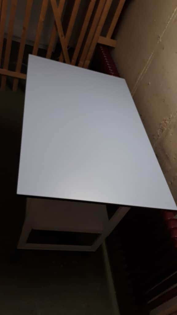 Lila kleur, met witte stalen poten.