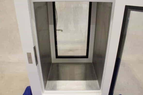 Cabinet met magnetisch gesloten deuren voor het doorgeven van materialen in en uit een cleanroom.
