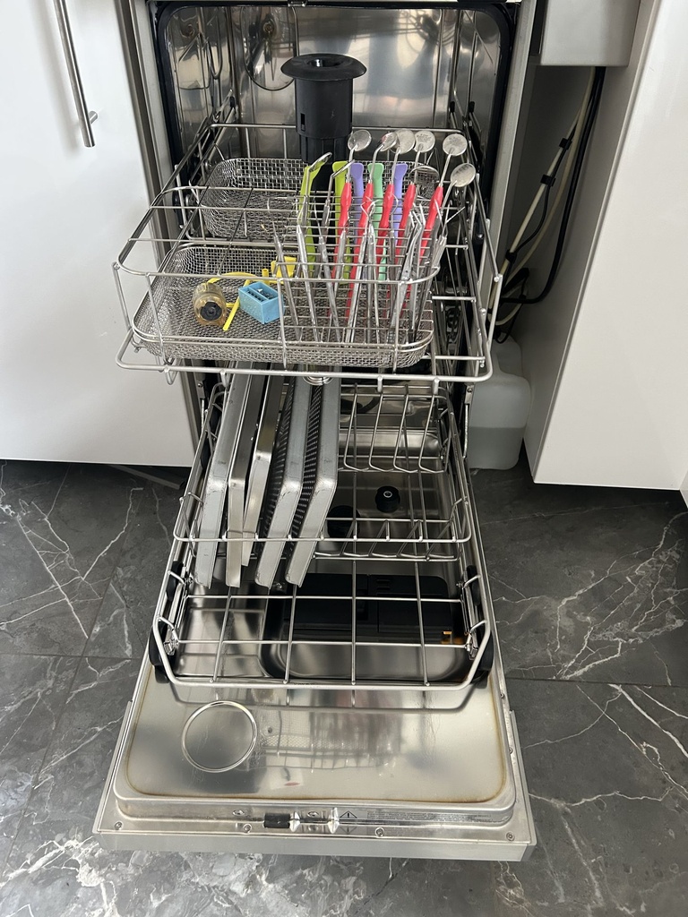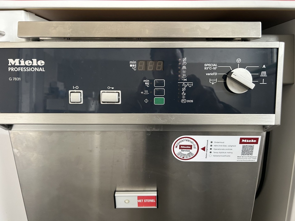 Deze thermodesinfector werd alleen maar 2 keer per week gebruikt omdat hij voor een praktijk met 1 behandelkamer en met 1 behandelaar is. Hij werd elk jaar door Miele bedrijf onderhoudt en hij is in een goede staat, zonder problemen. In totaal heeft hij 1861 uur gedraaid.