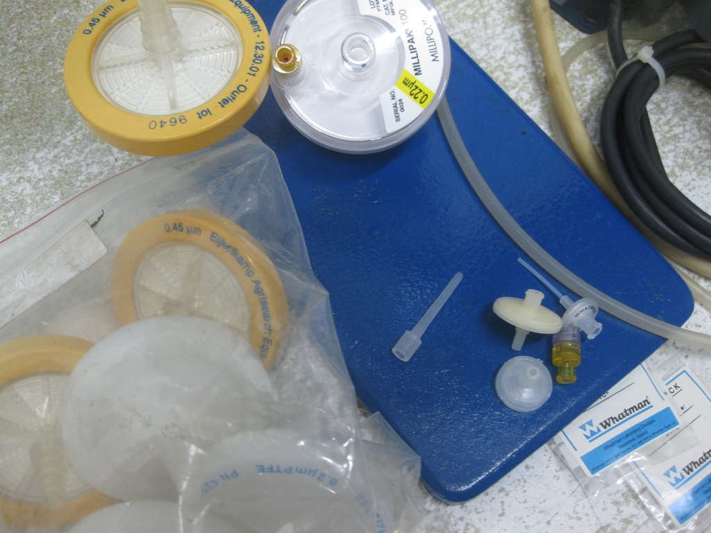Een filtratie opstelling met Millipore filters met een zuig-pers pompje van Cole-Parmer.