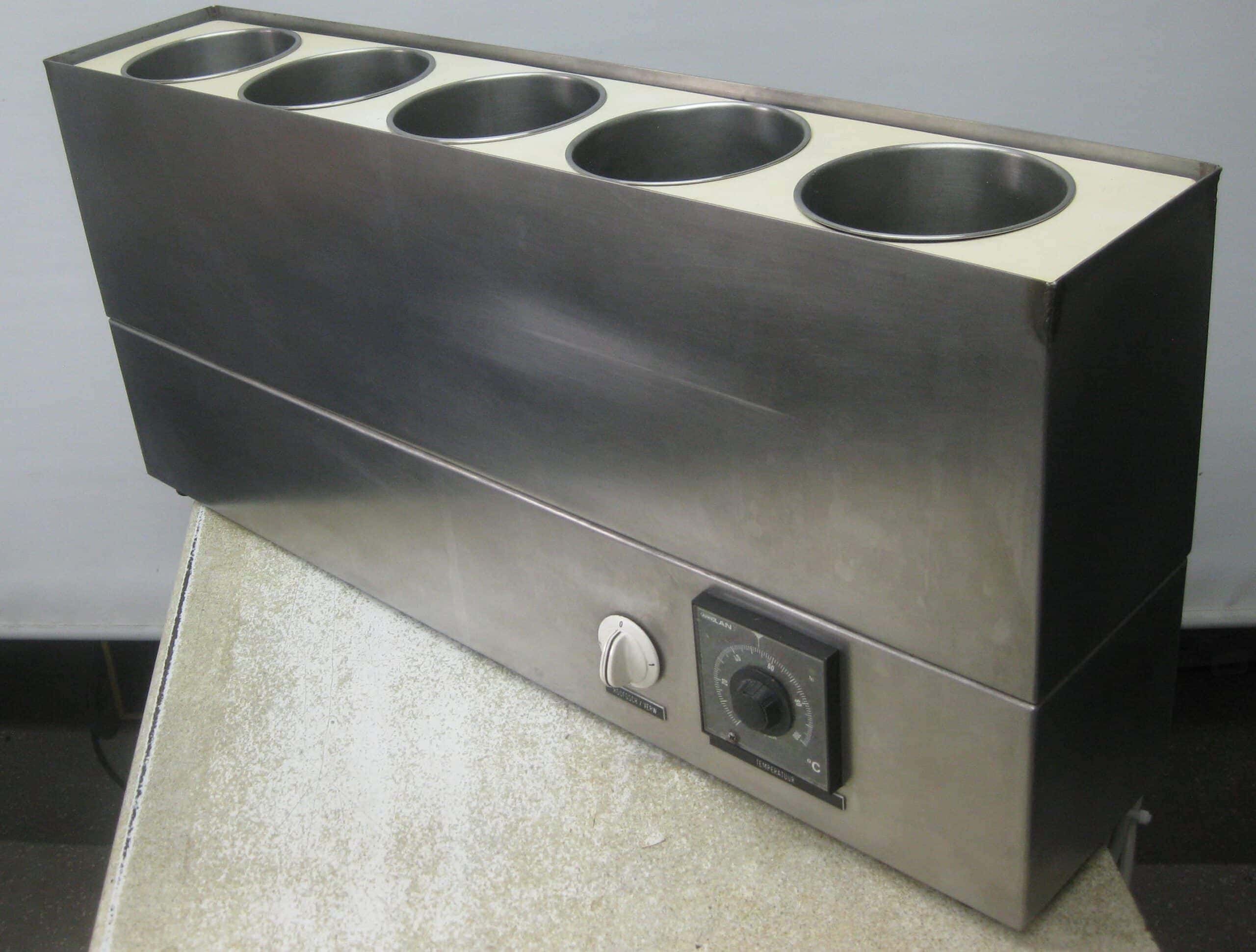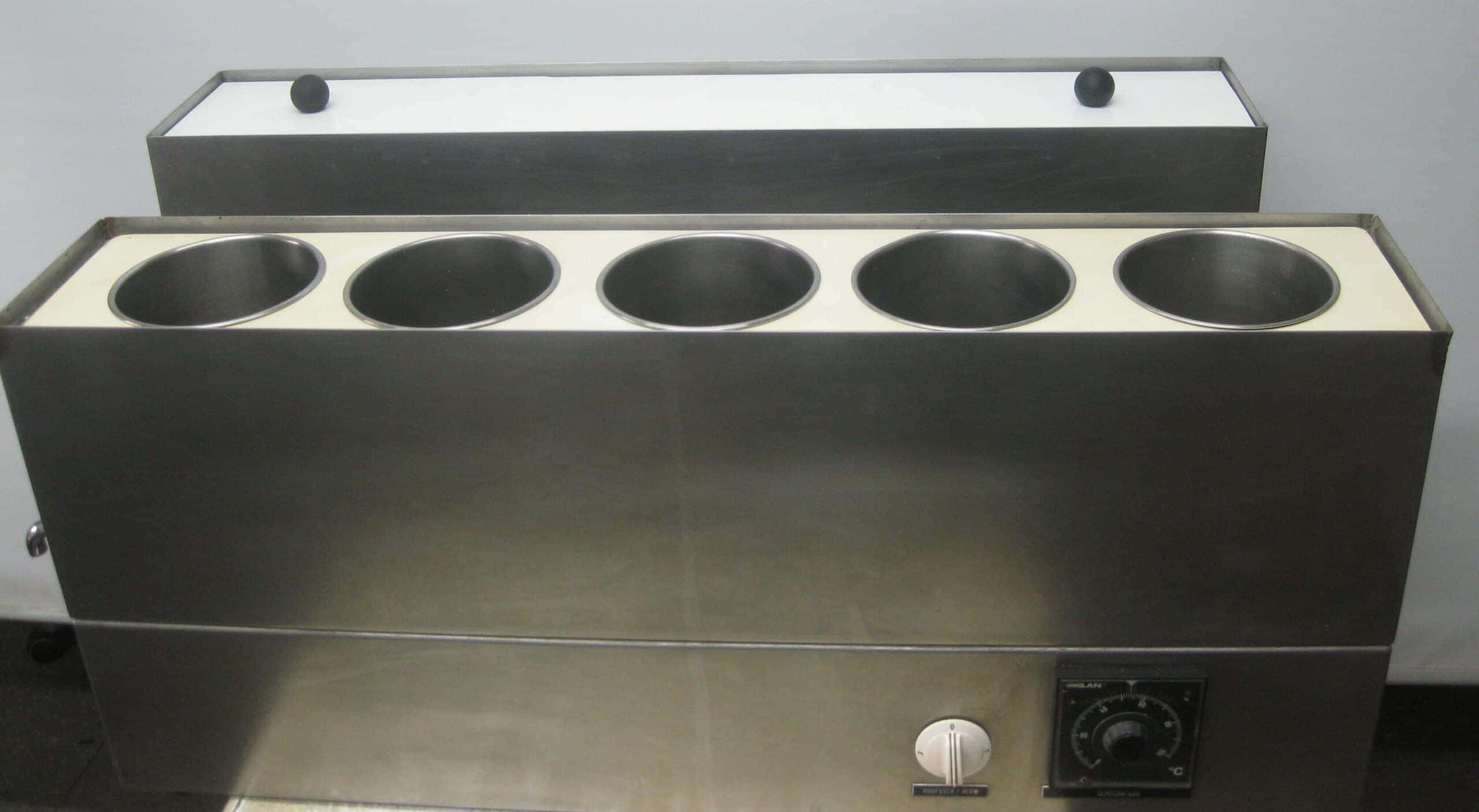 Twee Novex RVS waterbaden met 5 inzetten met een doorsnede van 130 mm.