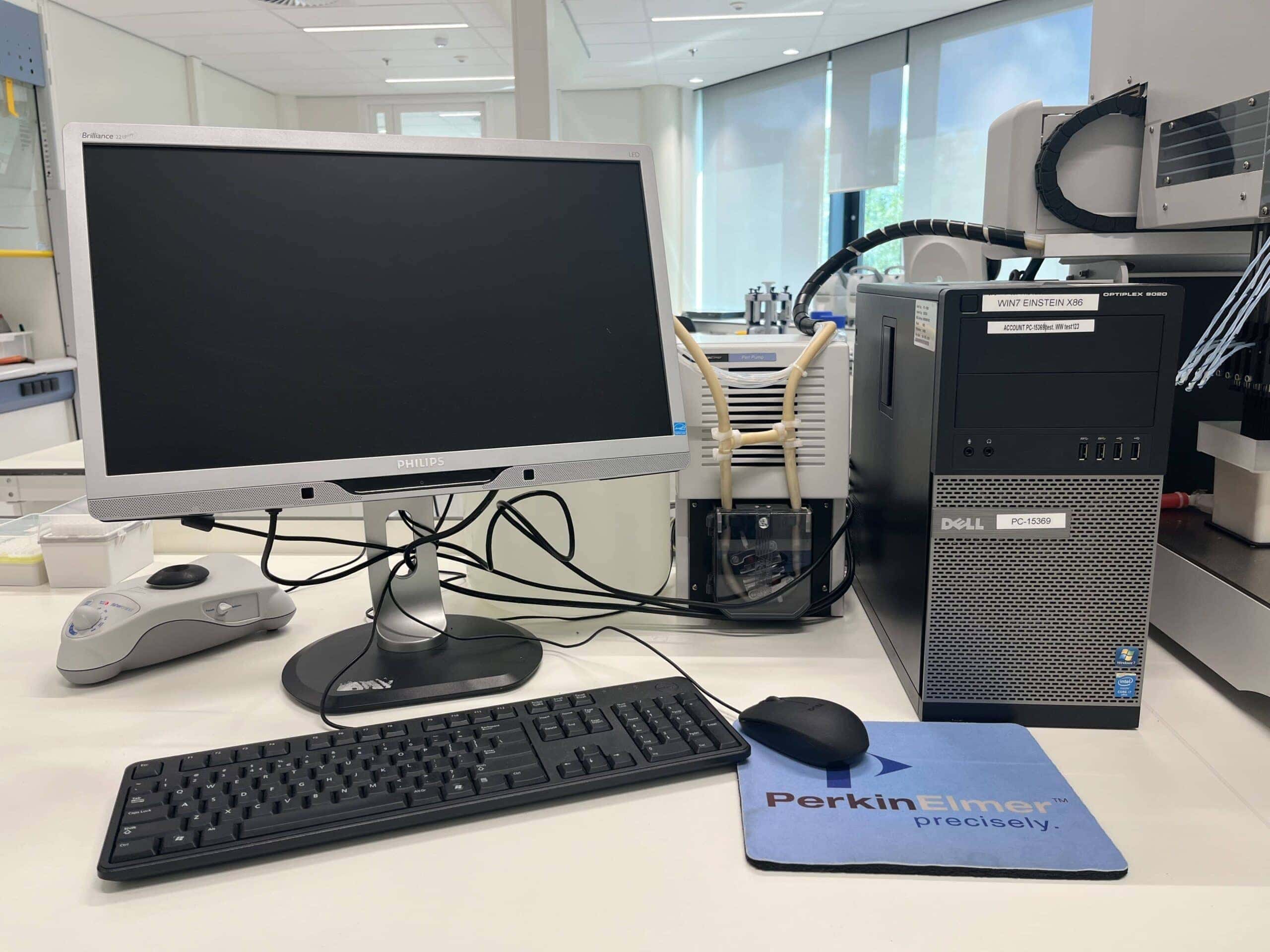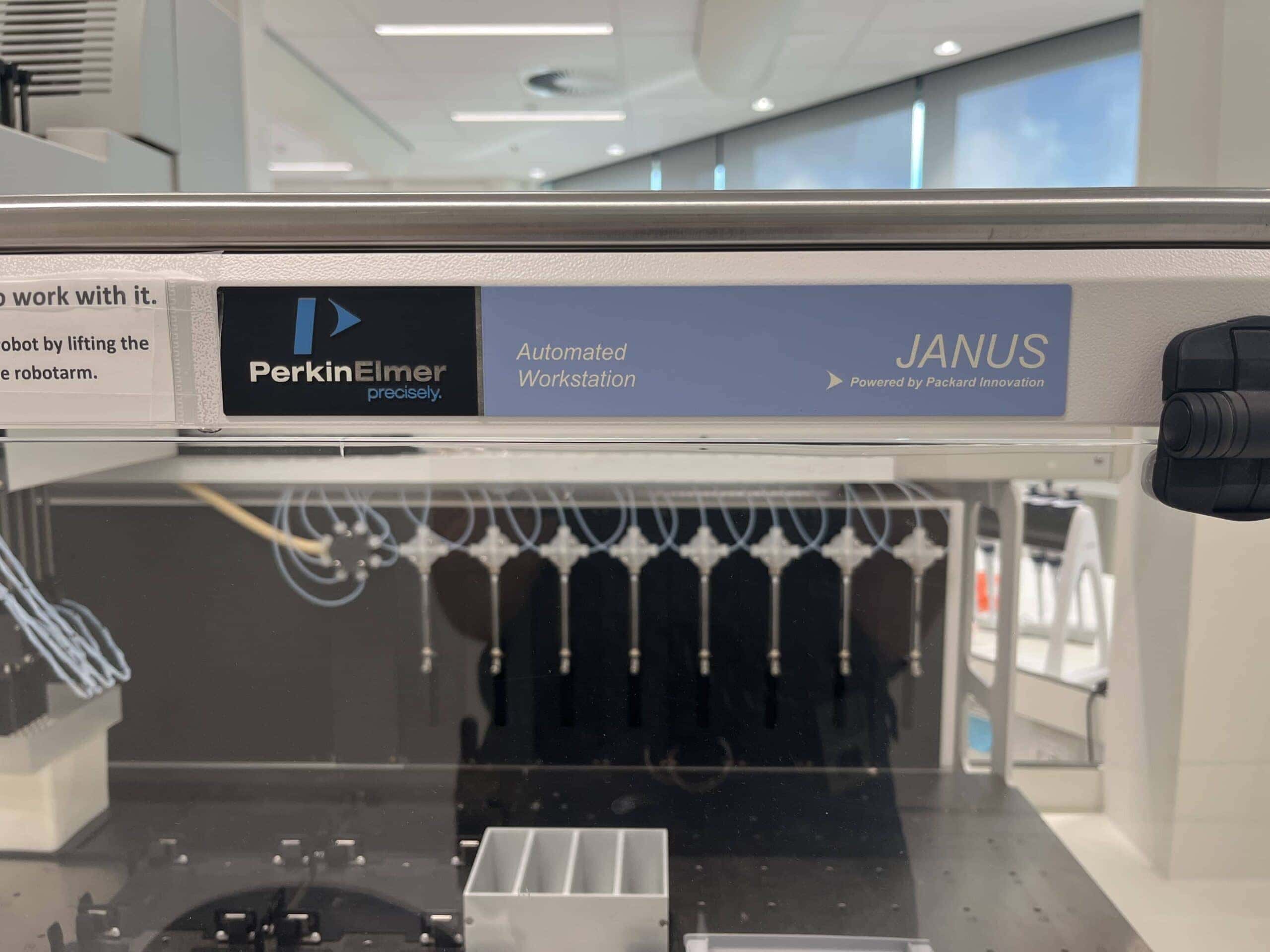 De pipetteerrobot van het merk Perkin Elmer type Janus is ontworpen voor de automatisering van monster voorbereidingsprocedures in o.a. de farmaceutische industrie, biotechnologie, onderzoek en klinische toepassingen. Deze pipetteerrobot kan pipetteren via een multi-tip-modus in verschillende laboratoriumcontainers, waaronder 384-wells platen en 1536-wells platen voor volledige assay automatisering. Verder wordt de Perkin Elmer Janus bestuurd door de softwareapplicatie WinPREP op een Windows XP-compatibele computer.