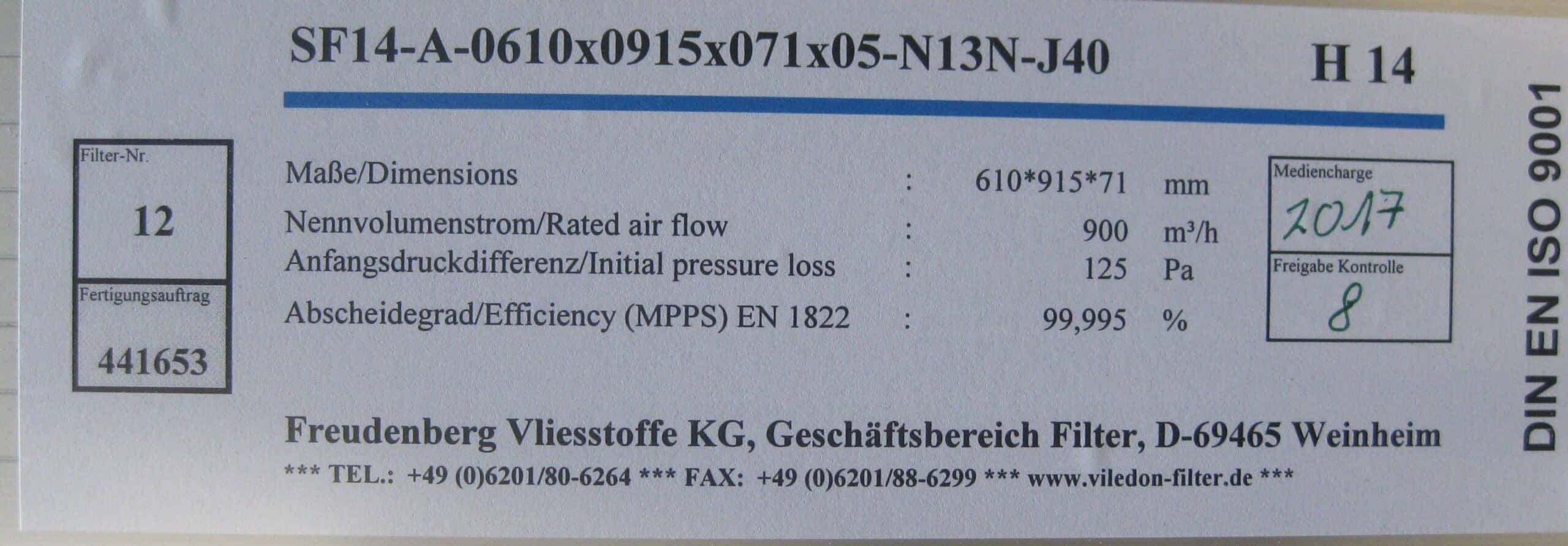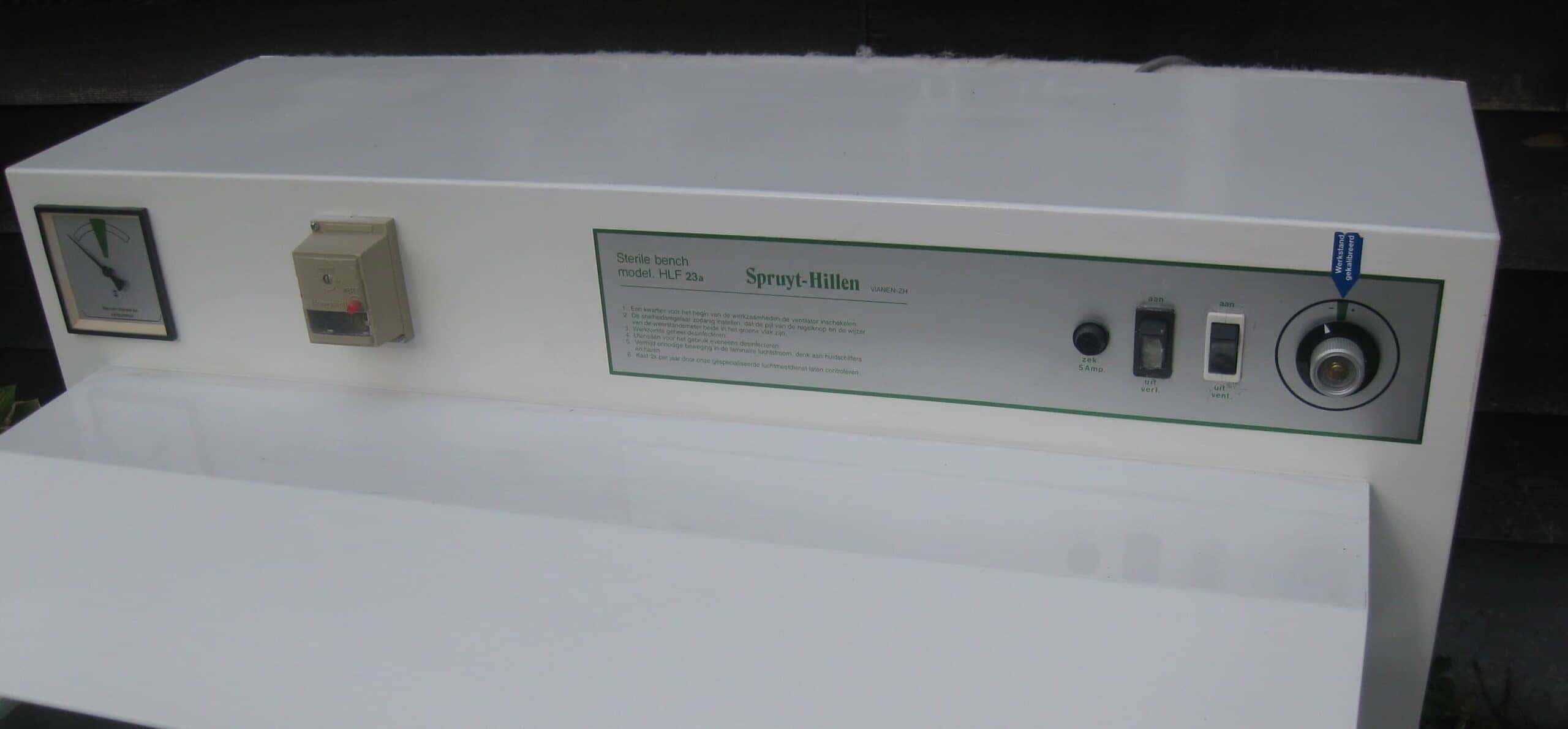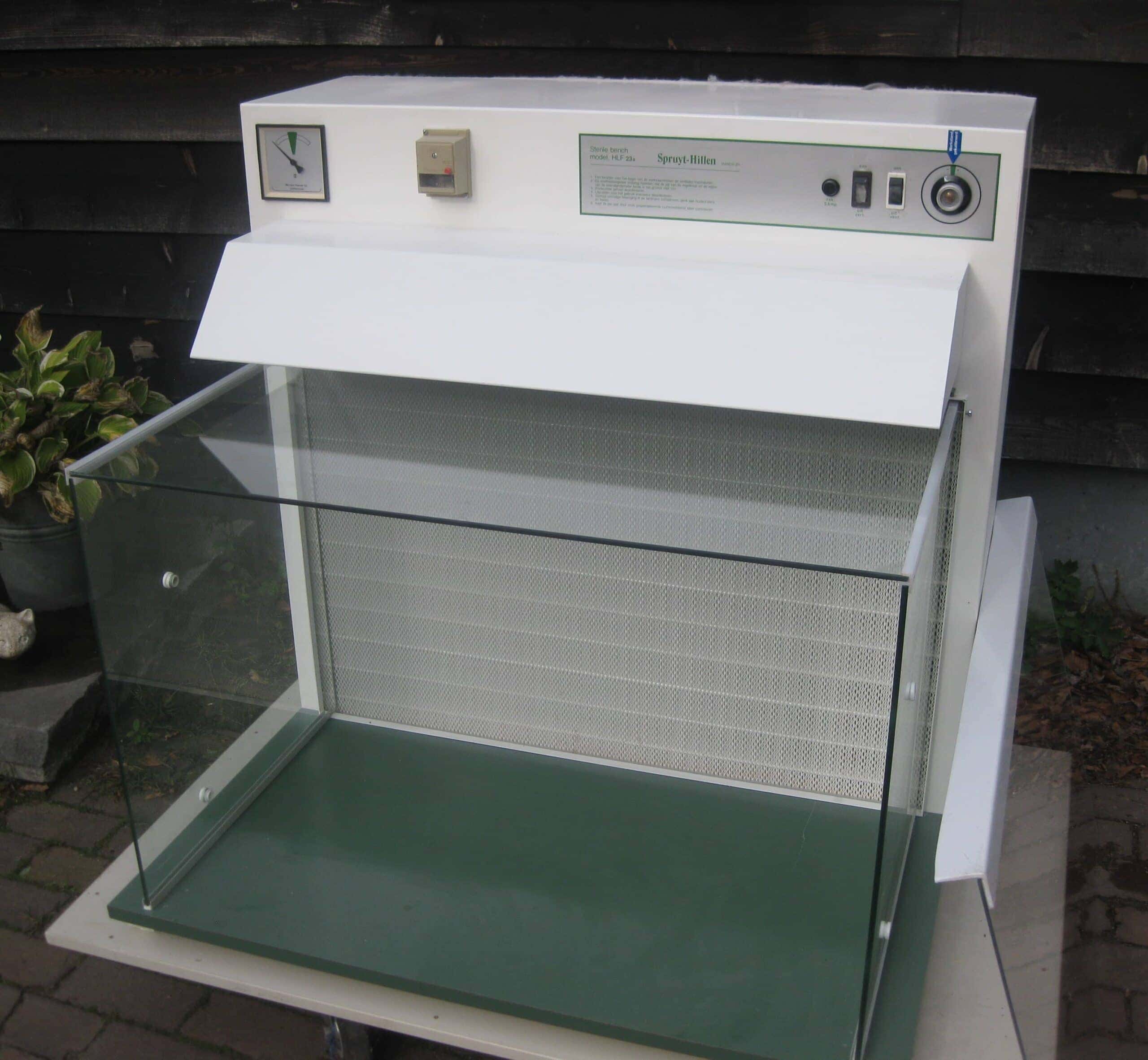 Een flowkast van Spruyt-Hillen met een H14-HEPA filter (zie foto), aan de achterzijde van de werkruimte.