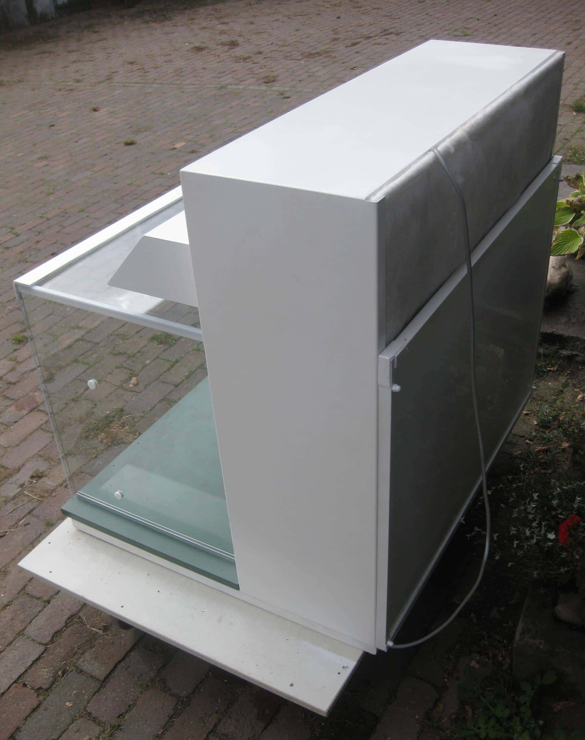 Met een perspex voorscherm, wanneer de kast niet in gebruik is.