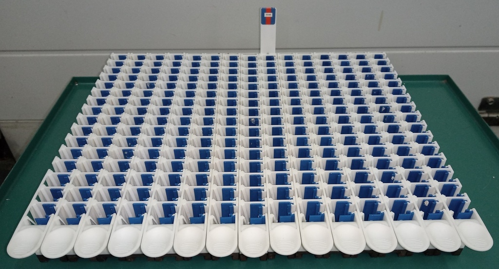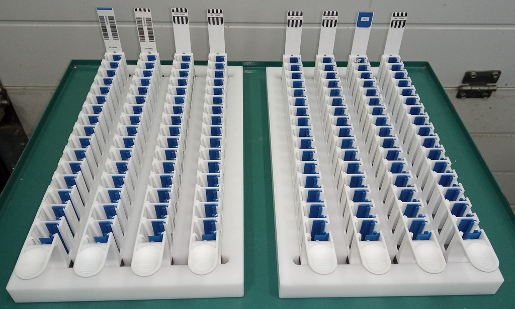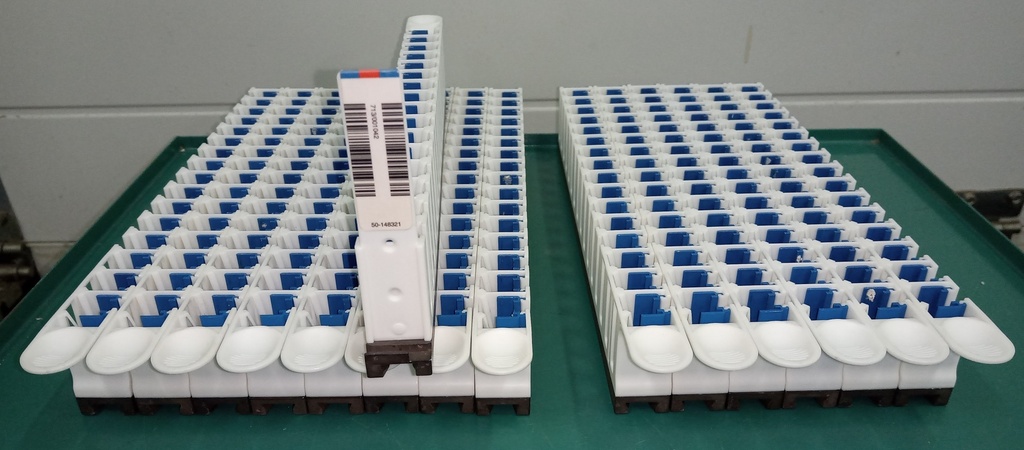 Drieëntwintig stripracks voor 13 mm buizen, blauw (Abbott-lijstnummer 04J72-82, Tecan-onderdeelnummer WA 11522/226). Ze zijn afkomstig van het Abbott m2000sp-systeem, maar kunnen ook worden gebruikt met het Tecan Evo-systeem. Sommige hebben barcodes, de meeste niet (barcodes zijn elders apart verkrijgbaar). De verkoop omvat twee PTFE-houders die elk vier stripracks kunnen bevatten.